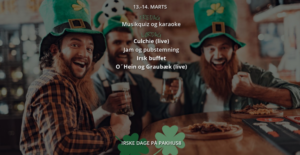 At 6:30 PM, we serve a classic Irish buffet, and at 8:30 PM we go live with O’Hein & Graubæk.